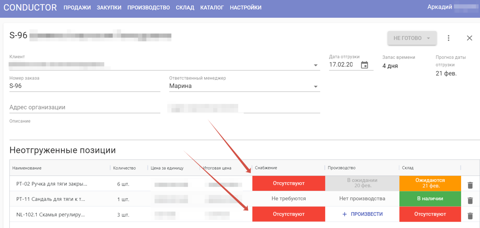После добавления заказа(ов) в таблицу, система выделяет красным те позиции, для которых недостаточно материалов на складе и сразу рассчитывает время прибытия закупки на склад. Снабженец всегда знает, какое сырье закупать сегодня и на этой неделе.